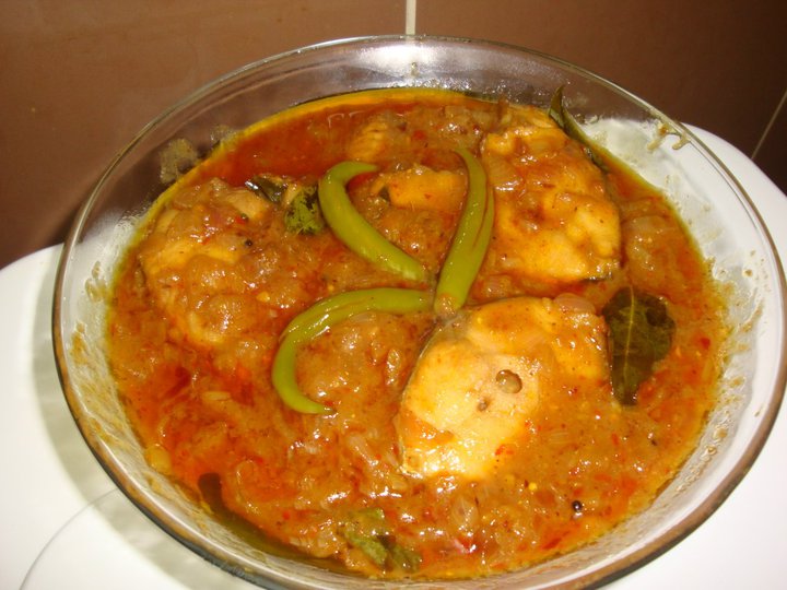 Fish & potatoes cooked with very hot chili sauce garnished with coriander